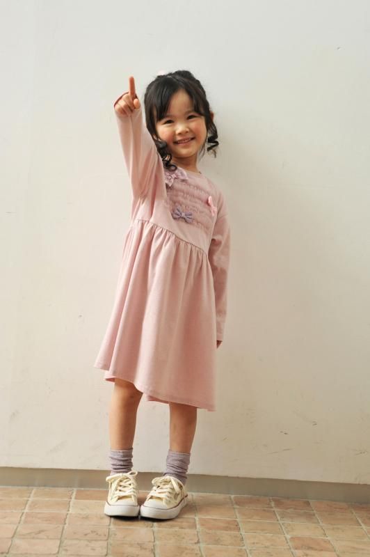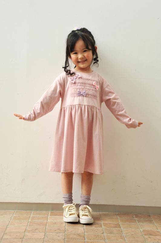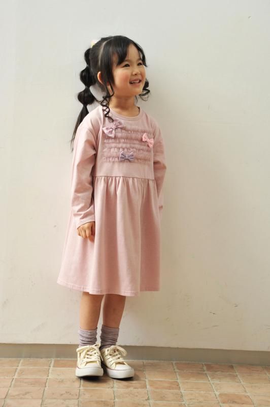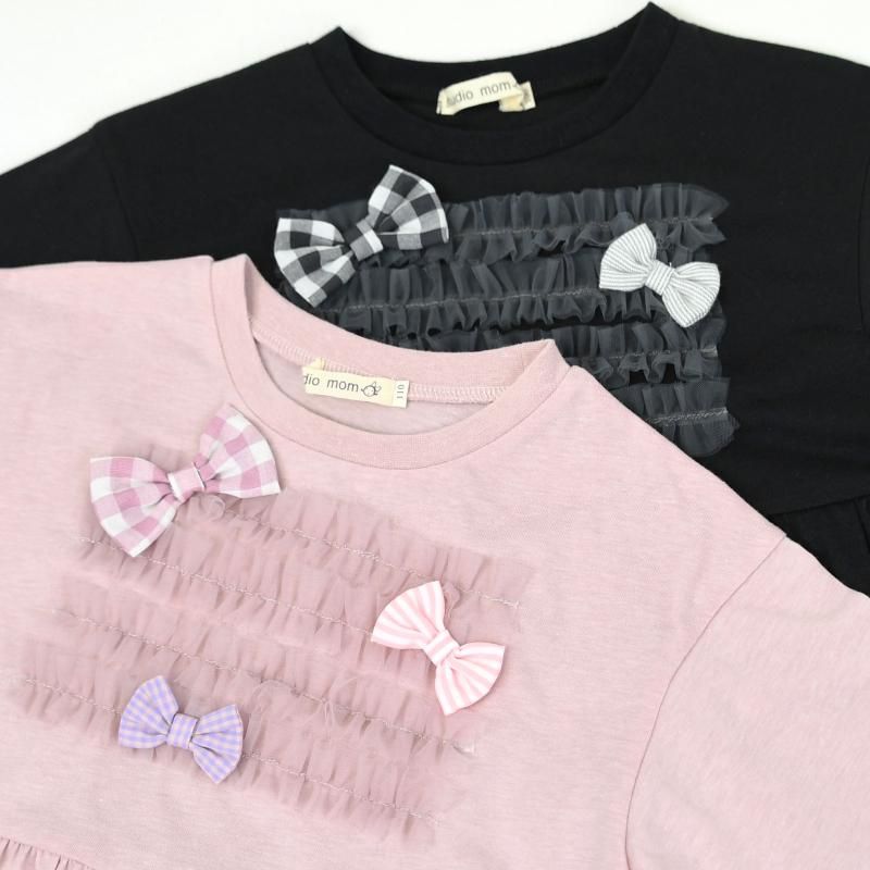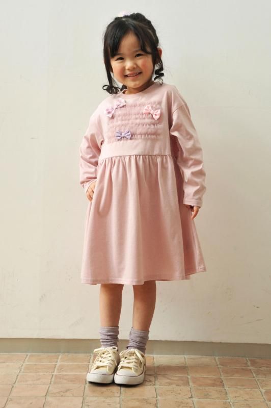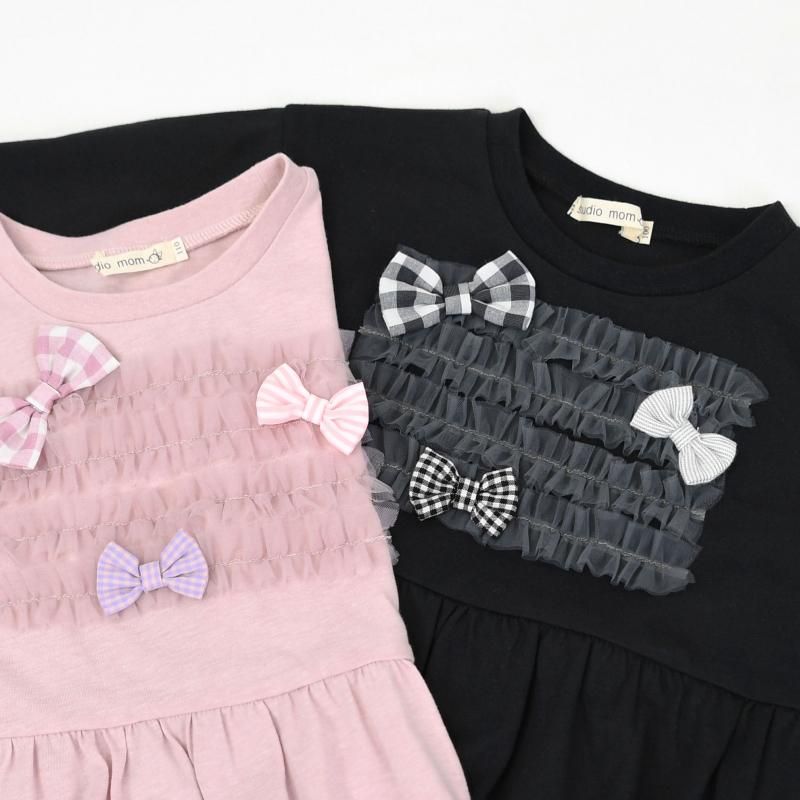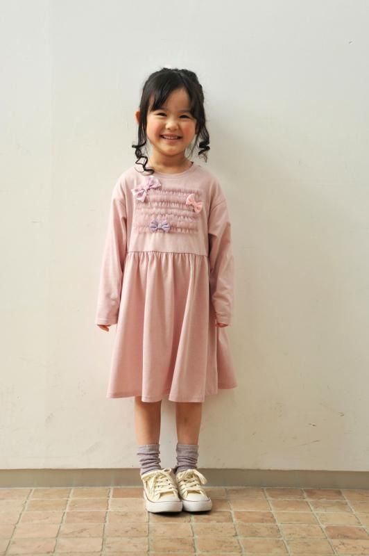 【ワンピ】シンプルなシルエットにおリボンいっぱいのワンピースです。